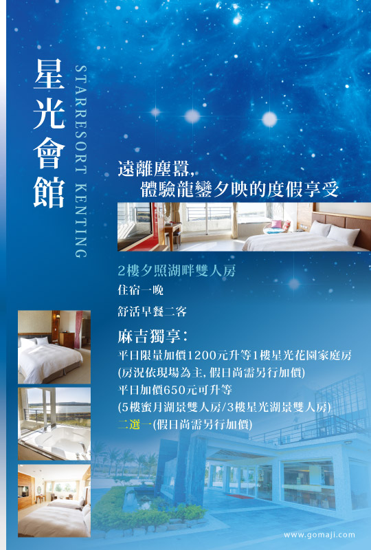 只要1899元,即可享有【墾丁-星光會館】遠離塵囂,體驗龍鑾夕映的度假享受~〈含2樓夕照湖畔雙人房住宿一晚 + 舒活早餐二客〉麻吉獨享2選1:a.週日至週四限量加價1200元升等1樓星光花園家庭房(房況依現場為主)/b.週日至週四加價650元可升等(5樓蜜月湖景雙人房/3樓星光湖景雙人房,二選一),週五至週六需另加價